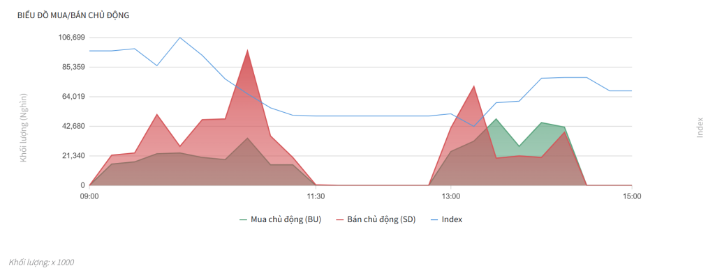 - Phiên sáng (9h00 – 11h30): Lực Bán chủ động (đỏ) áp đảo hoàn toàn lực Mua chủ động (xanh lá). Rất hiếm khi có áp lực bán mạnh ngay từ phiên sáng như thế này.