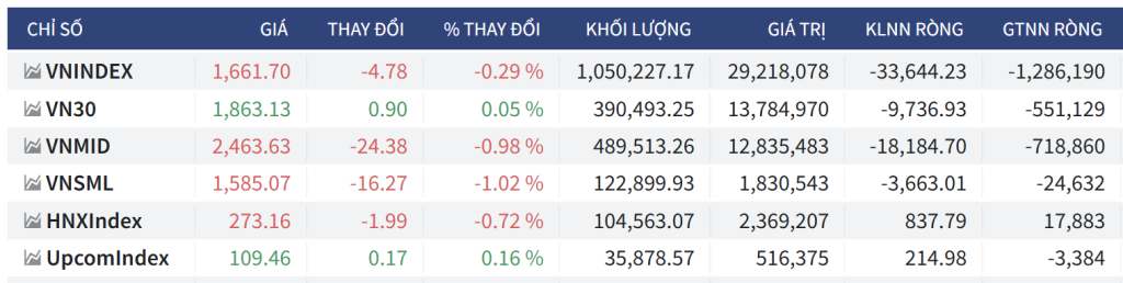 Kết thúc phiên giao dịch ngày 30/09, VN-Index đóng cửa tại 1,661.7 điểm, giảm 4.8 điểm (tương đương 0.3%). Thanh khoản thị trường đạt 1,139 triệu cổ phiếu khớp lệnh, tương ứng giá trị giao dịch xấp xỉ 32,043 tỷ. Thị trường nghiêng về số mã giảm với tỷ lệ mã tăng giá/mã giảm giá là 82/241. Nhóm Công nghệ Thông tin Hóa chất là tác nhân chính khiến VN-Index giảm điểm. Ngoài ra, những nhóm ngành khác có sự giảm giá đáng kể là Điện, nước & xăng dầu khí đốt, Tài nguyên Cơ bản, Xây dựng và Vật liệu.