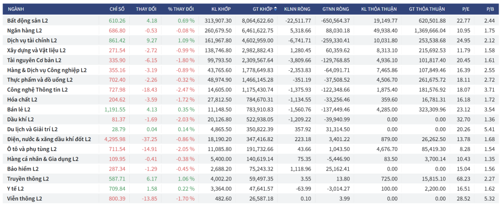 - Dòng tiền vẫn tập trung vào Blue-chip: Ba ngành Bất động sản, Ngân hàng và Dịch vụ tài chính vẫn là ba ngành có giá trị giao dịch lớn nhất.