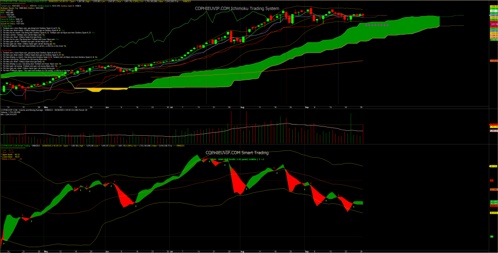 - Hình thái nến: Cây nến ngày 30/09 là một cây nến đỏ thân nhỏ, có bóng nến dưới dài (tương tự nến Hammer đỏ). Mẫu hình này cho thấy trong phiên, phe mua đã cố gắng đẩy giá lên cao hơn nhưng đã gặp áp lực bán chốt lời khiến giá đóng cửa giảm nhẹ so với giá mở cửa. Tuy nhiên, lực cầu bắt đáy đã xuất hiện mạnh mẽ ở vùng giá thấp, giúp chỉ số không giảm sâu và duy trì được cấu trúc tăng giá.