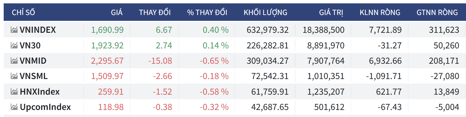 - Đóng cửa tại 1,690.99 điểm, tăng +6.67 điểm (+0.40%).