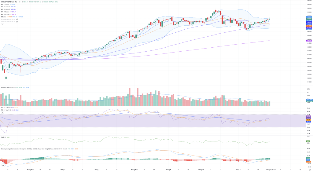 - Đánh giá: CMF dương là tín hiệu tích cực về dòng tiền, xác nhận dòng tiền đang tích lũy.