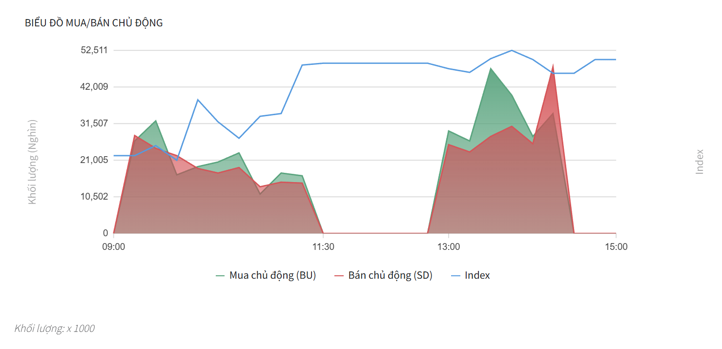 - Phe Mua chủ động (màu xanh) chiếm ưu thế ngay từ đầu giờ mở cửa, tạo ra một nhịp hưng phấn kéo chỉ số Index đi lên.