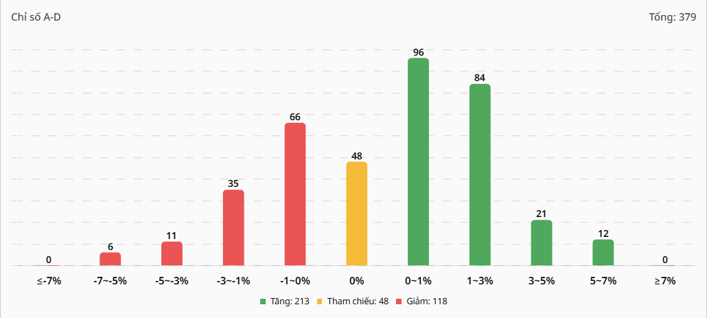 - Thị trường ghi nhận sự đảo chiều tích cực mạnh mẽ với 213 mã tăng, vượt xa con số 118 mã giảm và 48 mã giữ mức tham chiếu trên tổng số 379 mã được thống kê.