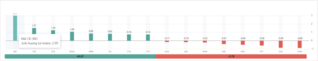- Các mã khác có tác động tiêu cực nhẹ bao gồm: FPT (-0.58 điểm), HPG (-0.49 điểm), GEE (-0.41 điểm), VNM (-0.22 điểm), SSB (-0.18 điểm) và HVN (-0.17 điểm).