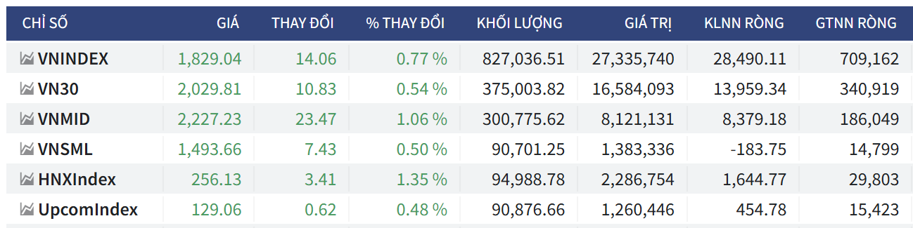 - Chốt phiên, VN-Index tăng 14,06 điểm (+0,77%), lên 1.829,04 điểm; HNX-Index tăng 3,41 điểm (+1,35%), lên 256,13 điểm; UpCoM-Index tăng 0,62 điểm (+0,48%), lên 129,06 điểm