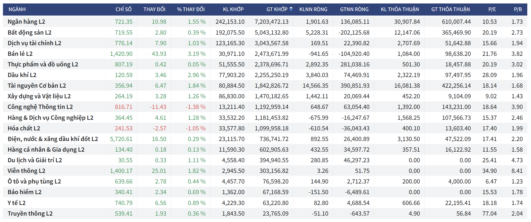 - Nhóm ngân hàng chiếm ưu thế áp đảo trong việc dẫn dắt chỉ số với các mã: TCB (+1.51 điểm), VCB (+1.24 điểm), MBB (+0.86 điểm) và CTG (+0.74 điểm).