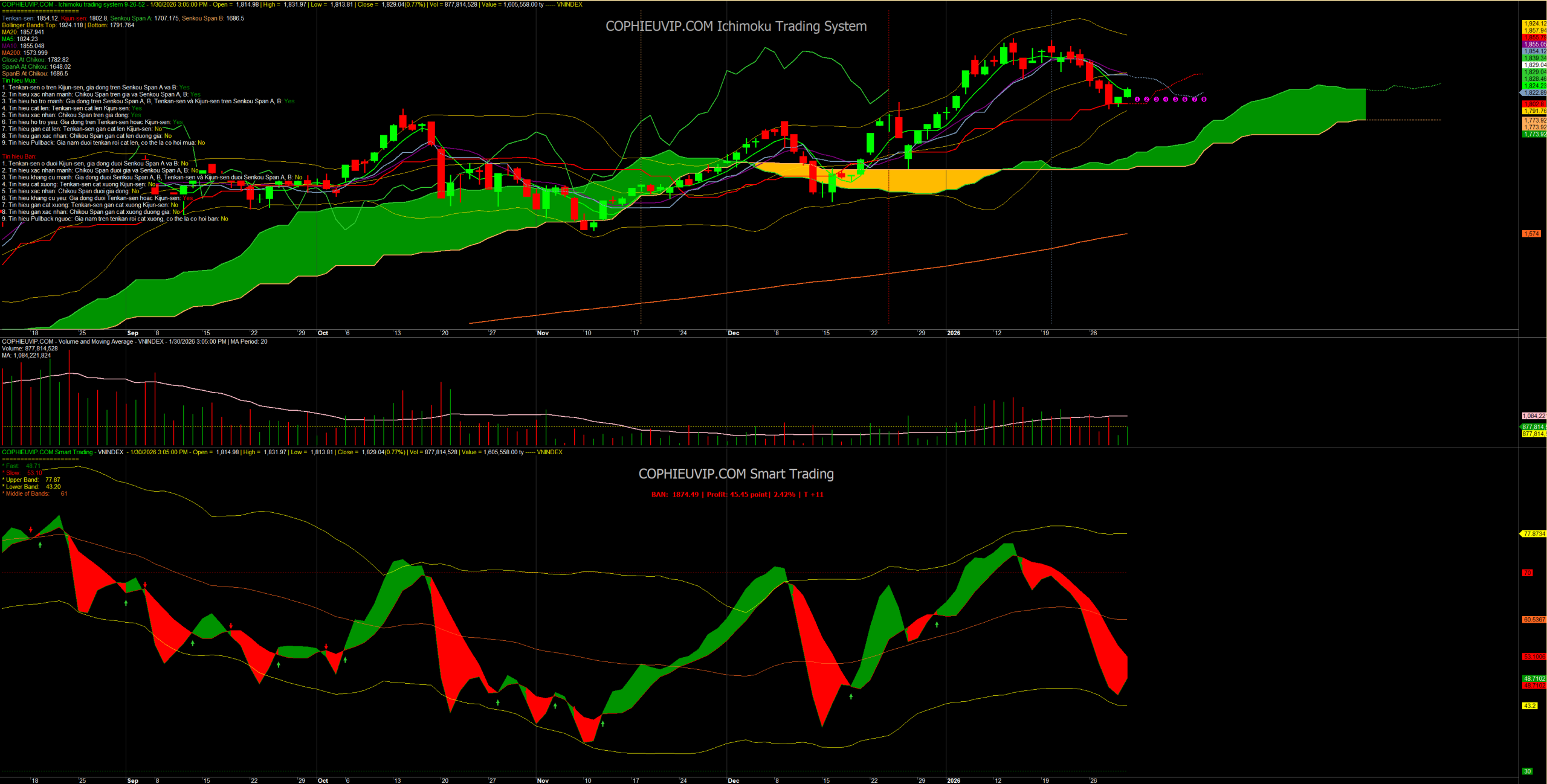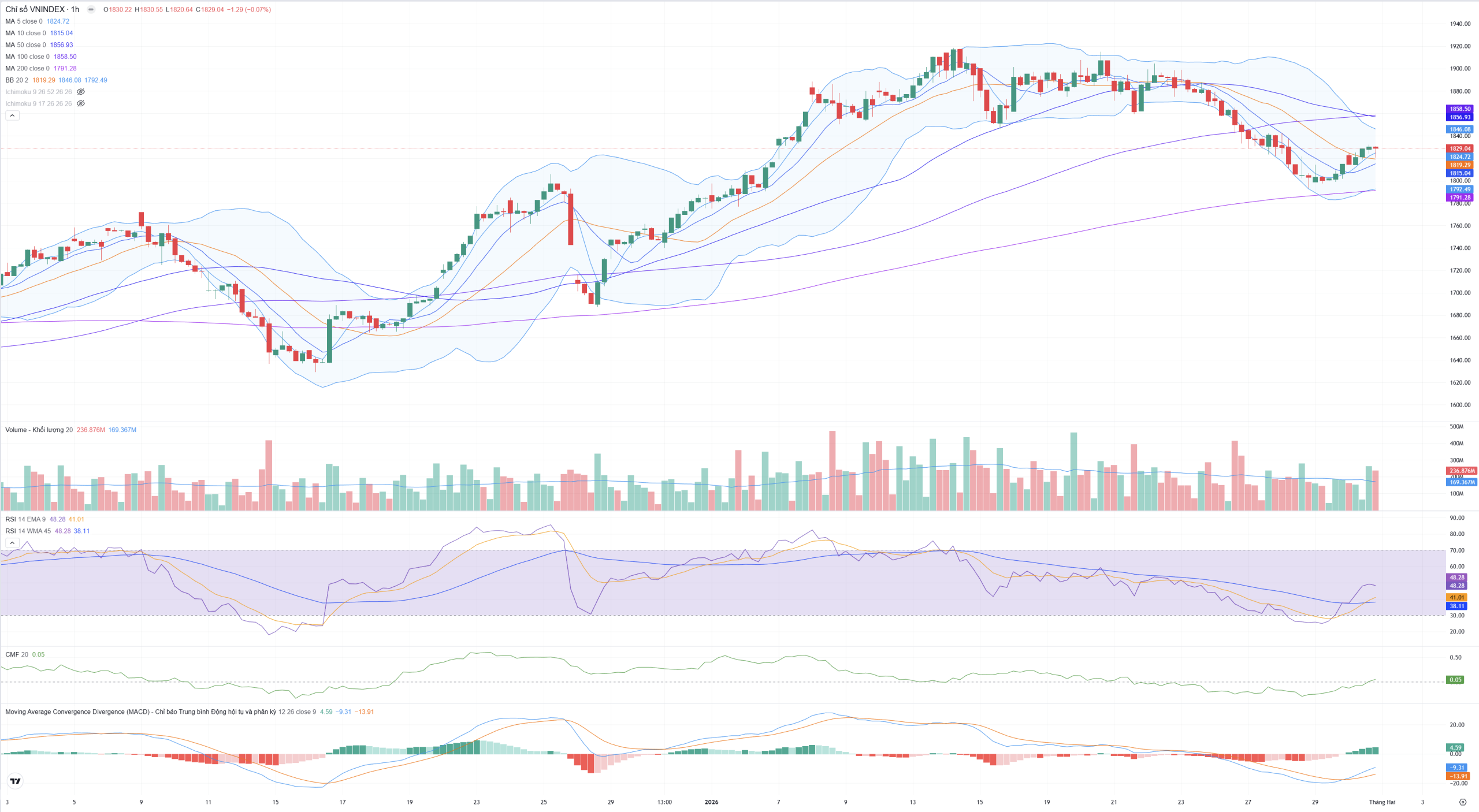 Kết luận sơ bộ: VN-Index phiên 30/01/2026 đã xác nhận sự phục hồi kỹ thuật đầy thuyết phục với nến rút chân mạnh và các chỉ báo động lượng (RSI, Histogram MACD) đồng loạt chuyển biến tích cực. Tín hiệu Phân kỳ dương ẩn của dòng tiền (CMF) kết hợp với việc giữ vững mốc 1,800 cho thấy nhịp giảm vừa qua chỉ mang tính chất rũ bỏ kỹ thuật để chuẩn bị cho một chu kỳ tăng giá mới hướng tới vùng 1,860 – 1,880.