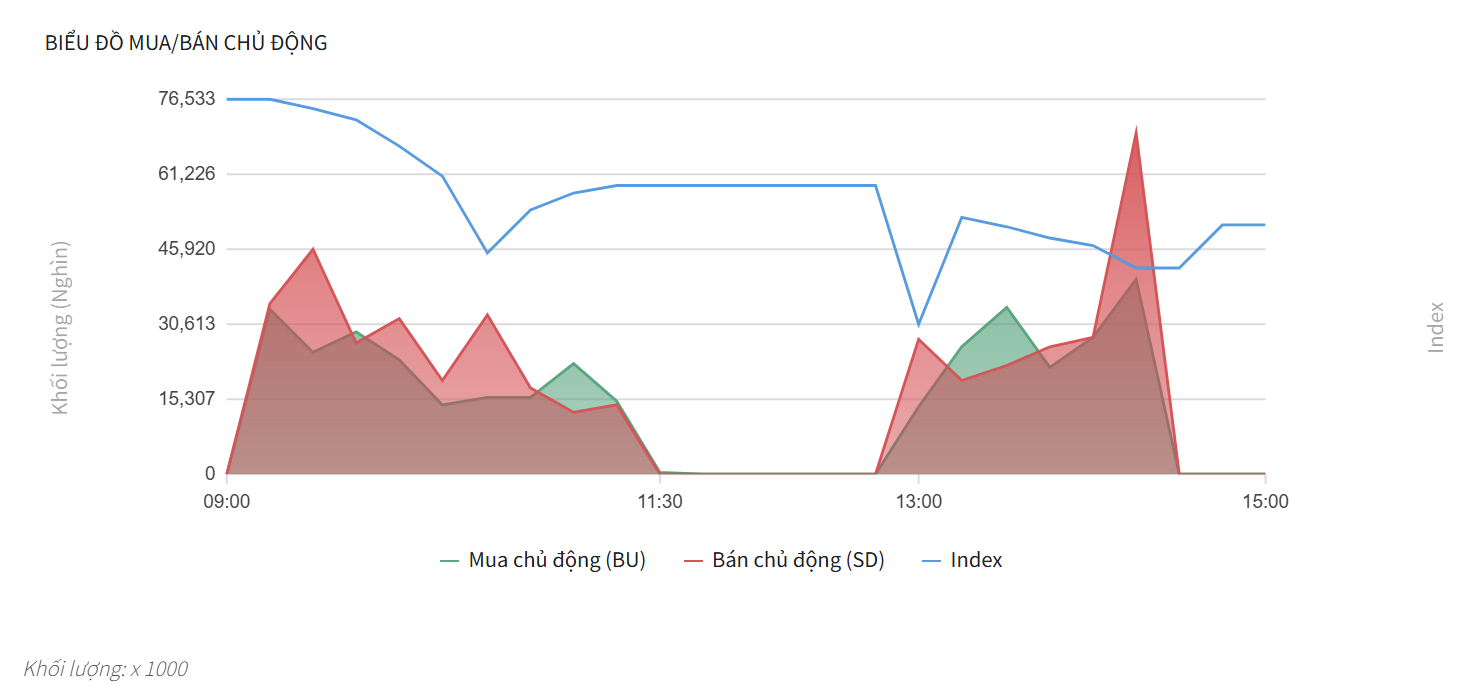 • Ngay từ đầu giờ sáng, áp lực bán chủ động (SD – màu đỏ) đã chiếm ưu thế áp đảo so với lực mua. Lực bán đạt đỉnh đầu tiên vào khoảng 09:45 với khối lượng xấp xỉ 46.000 nghìn đơn vị, khiến chỉ số Index bắt đầu đà sụt giảm.