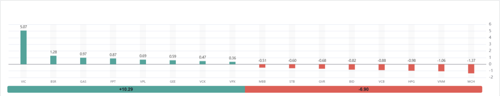 • VIC là “đầu tàu” kéo chỉ số mạnh nhất với mức đóng góp ấn tượng lên tới +5.07 điểm.