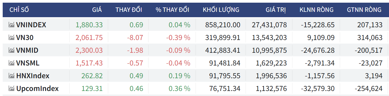 • Chỉ số đóng cửa tại 1.880,33 điểm, ghi nhận mức tăng nhẹ +0,69 điểm (+0,04%).