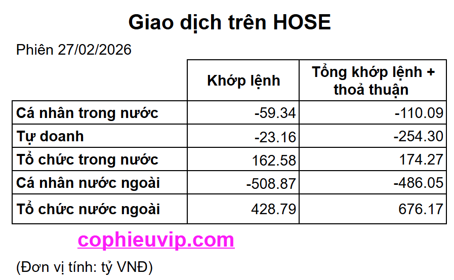 Kết luận sơ bộ: Phiên giao dịch ngày 27/02/2026 cho thấy trạng thái phân hóa rõ rệt giữa các nhóm vốn hóa. Trong khi VN-Index duy trì được sắc xanh nhẹ nhờ lực đỡ từ các sàn HNX và Upcom, thì nhóm cổ phiếu trụ VN30 lại chịu áp lực điều chỉnh khá mạnh. Điểm tích cực là khối ngoại đã quay lại mua ròng về giá trị trên sàn HOSE sau chuỗi phiên bán ròng trước đó, tập trung chủ yếu vào nhóm VN30.