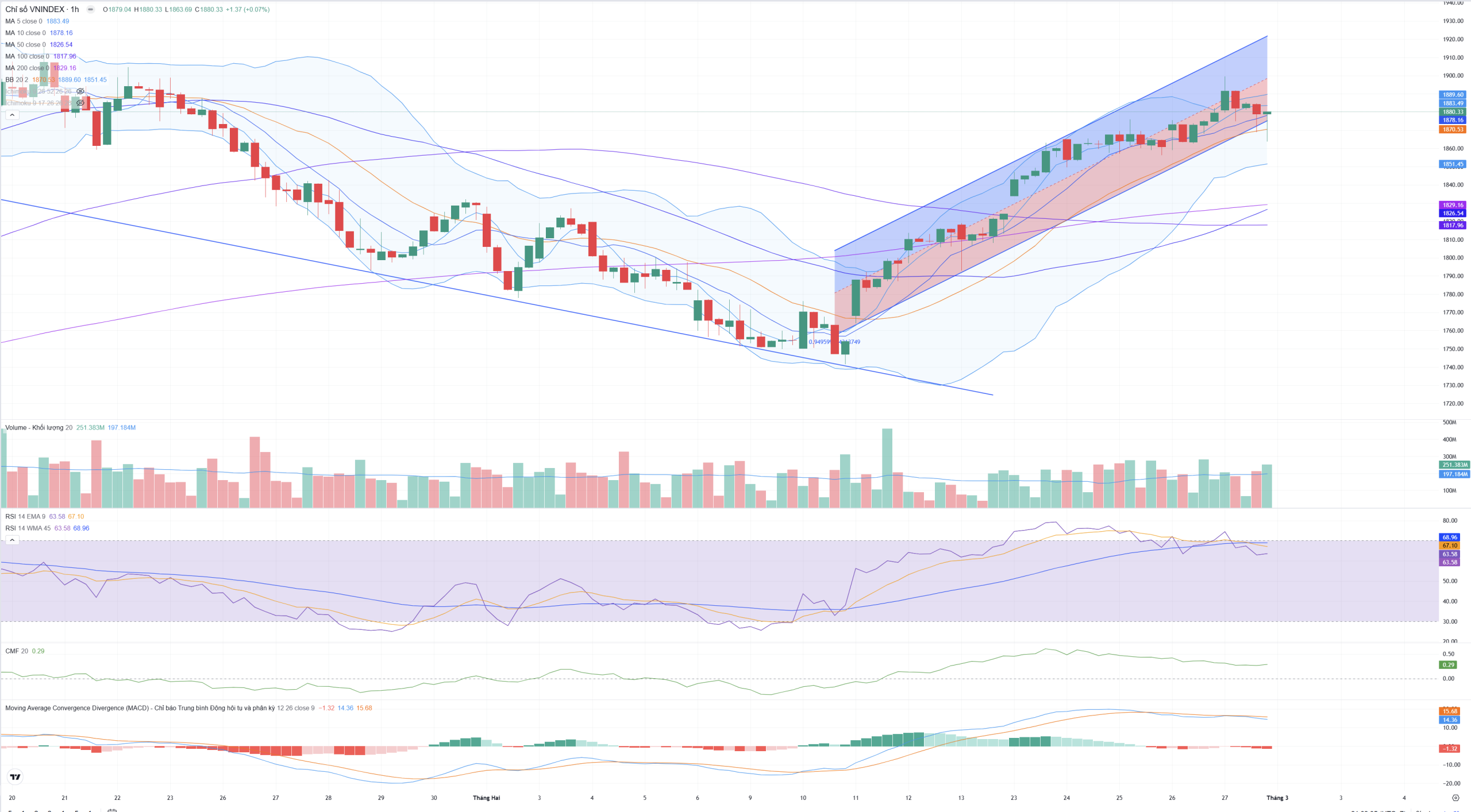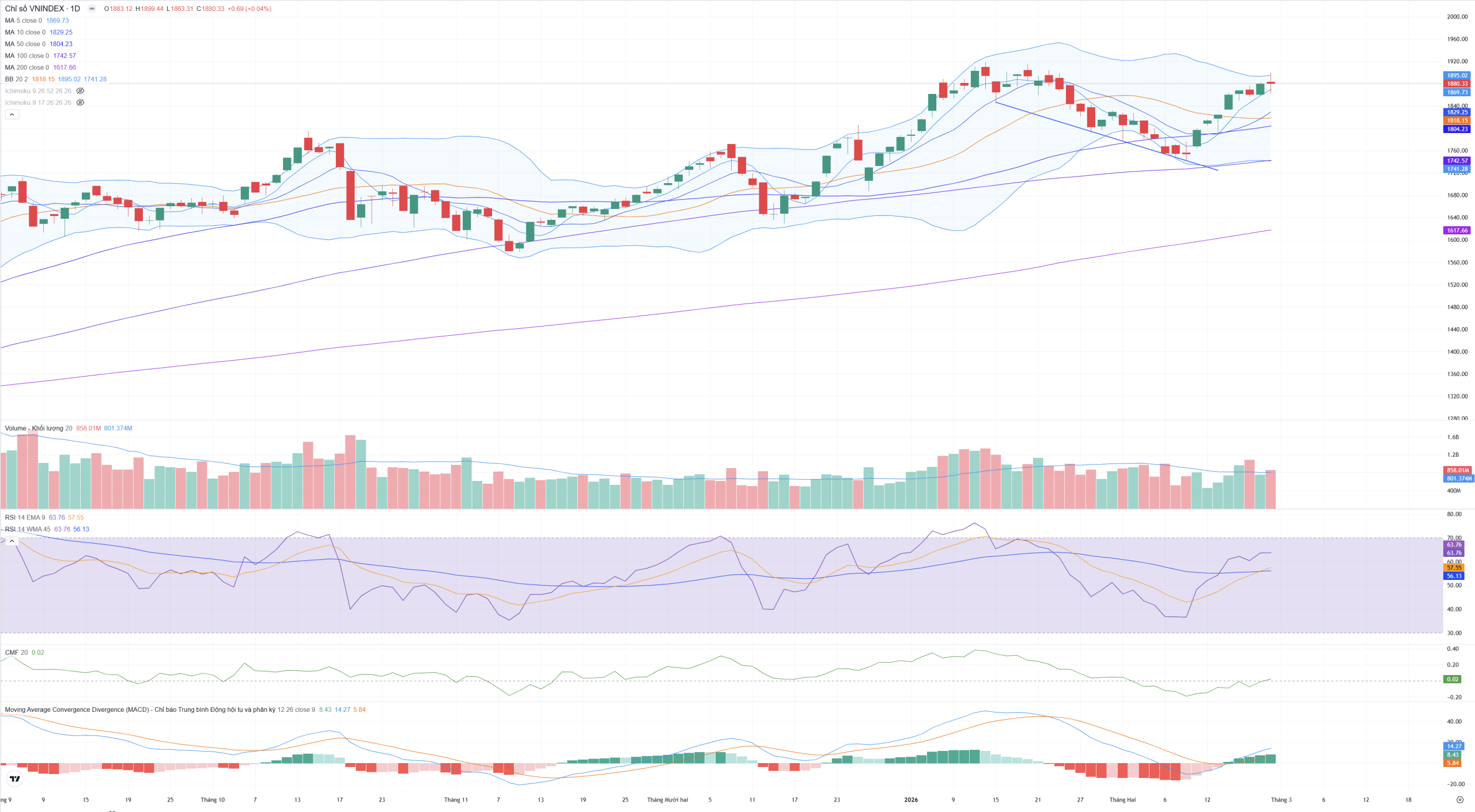 • Hỗ trợ: Ngưỡng hỗ trợ trực tiếp tại 1.870 (MA20) và hỗ trợ mạnh tại 1.851 (Dải dưới BB).