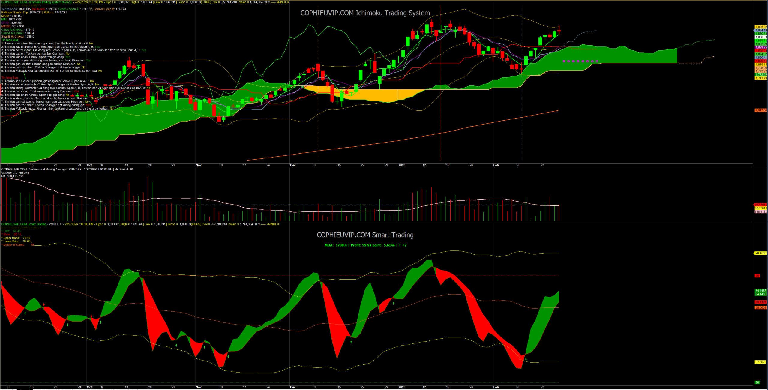 • Giá đóng cửa nằm ngay sát dải trên (Upper Band: 1.895,02), cho thấy biến động giá đang bám sát biên trên của xu hướng tăng.