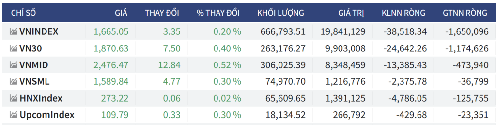 2. Chốt phiên, VN-Index tăng 3,35 điểm (+0,20%) lên 1.665,05 điểm; HNX-Index tăng nhẹ 0,06 điểm (+0,02%) lên 273,22 điểm; UPCoM-Index tăng 0,33 điểm (+0,30%) lên 109,79 điểm