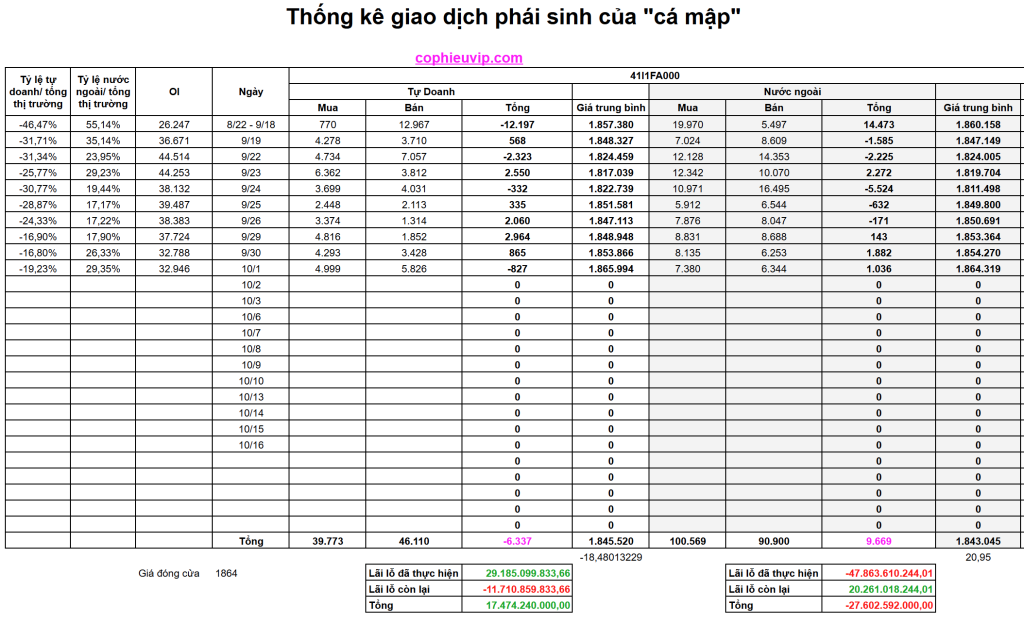 • Ngược lại, khối Nước ngoài vẫn đang ở vị thế Long ròng lũy kế lớn (+9,669 hợp đồng) nhưng lại đang quay sang lỗ (-27.6 tỷ).
