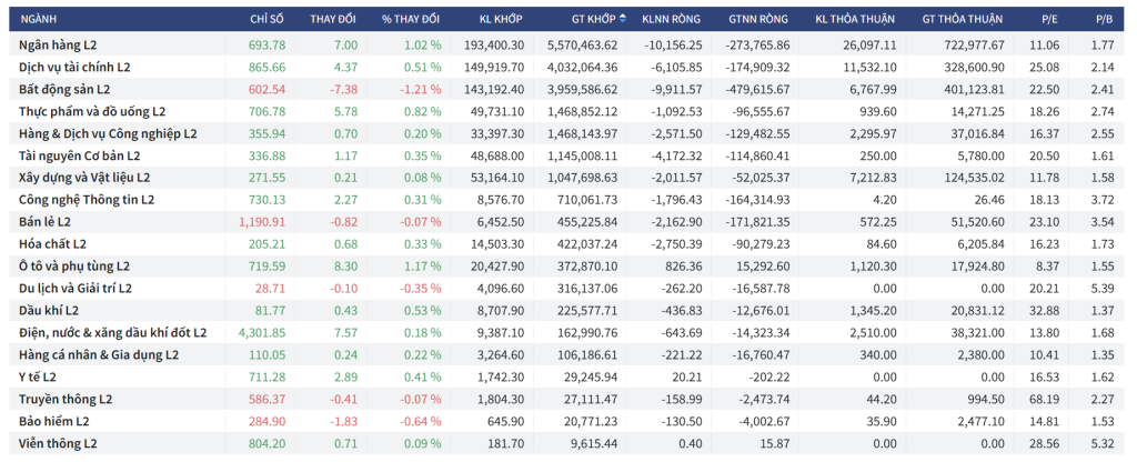 • Nhóm Tài chính dẫn dắt: Ba ngành có giá trị giao dịch lớn nhất và dẫn dắt đà hồi phục là Ngân hàng (+1.02%)Dịch vụ tài chính (+0.51%).