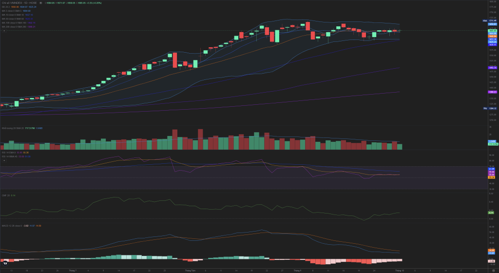 • Hình thái nến: Cây nến ngày 01/10 là một cây nến xanh thân nhỏ, có bóng nến trên và dưới dài (Spinning Top). Mẫu hình này, xuất hiện sau một chuỗi tăng điểm, thể hiện một sự lưỡng lự và giằng co quyết liệt giữa phe mua và phe bán. Đây là một tín hiệu chững lại đà tăng, cho thấy thị trường đang tìm kiếm một điểm cân bằng mới.