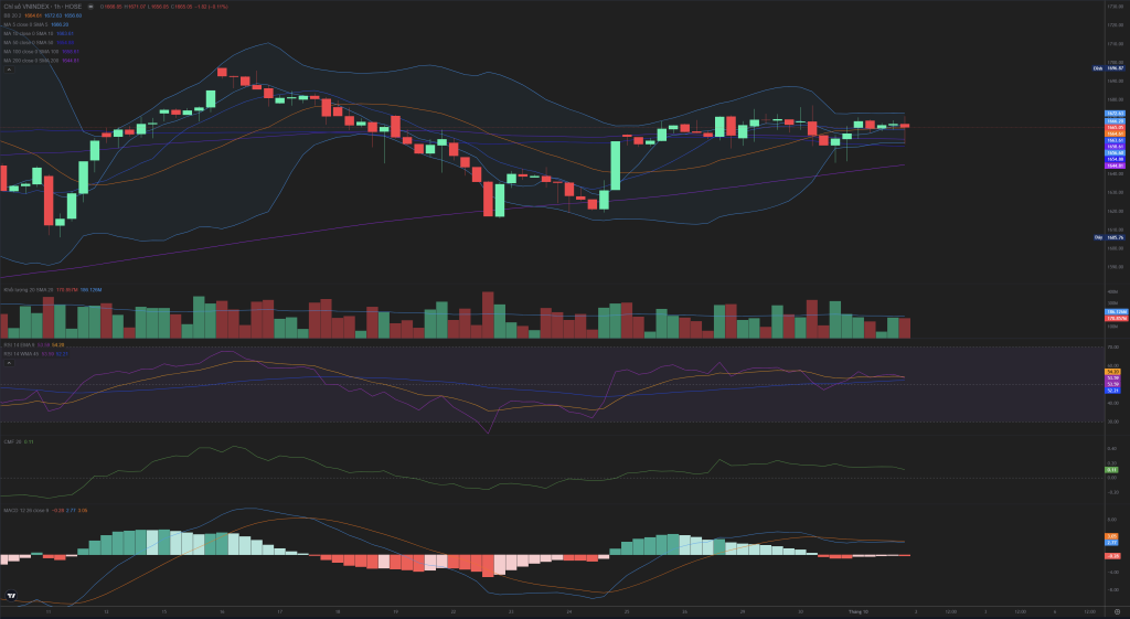 • Xu hướng: Tuy nhiên, đường CMF đang có xu hướng đi ngang và hơi chúc xuống, cho thấy sức mạnh của dòng tiền vào đang chững lại.