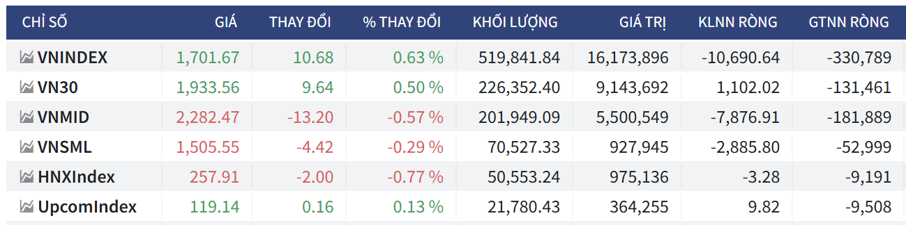 - Chốt phiên, VN-Index tăng 10,68 điểm (+0,63%), lên 1.701,67 điểm; HNX-Index giảm 1,52 điểm (-0,58%), xuống 259,91 điểm; UPCoM-Index tăng 0,16 điểm (+0,13%) lên 119,14 điểm