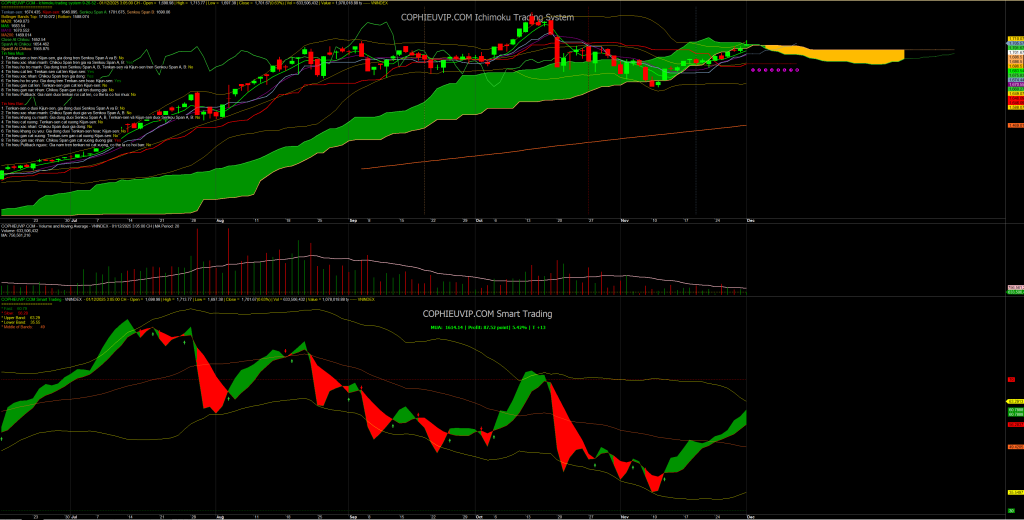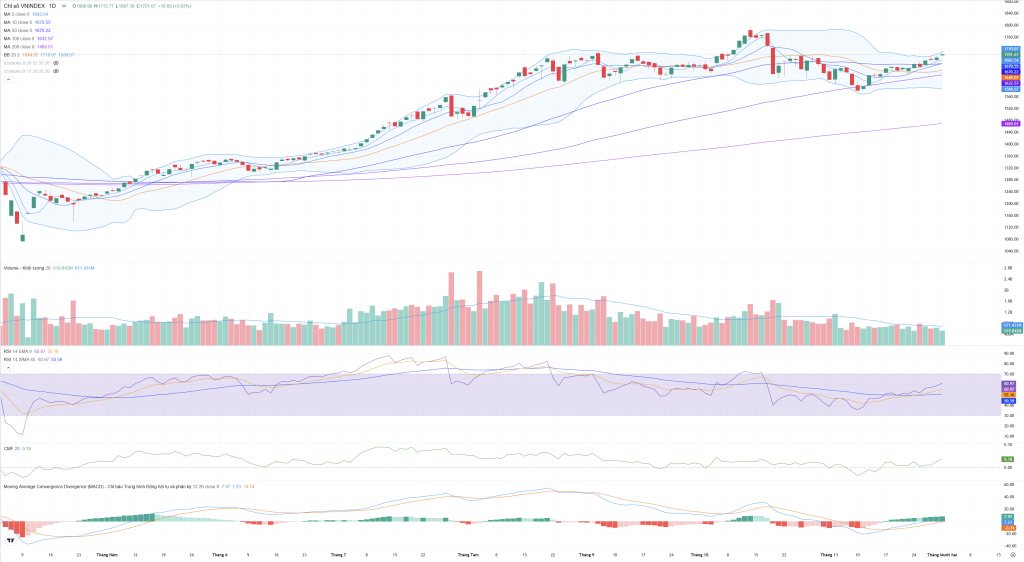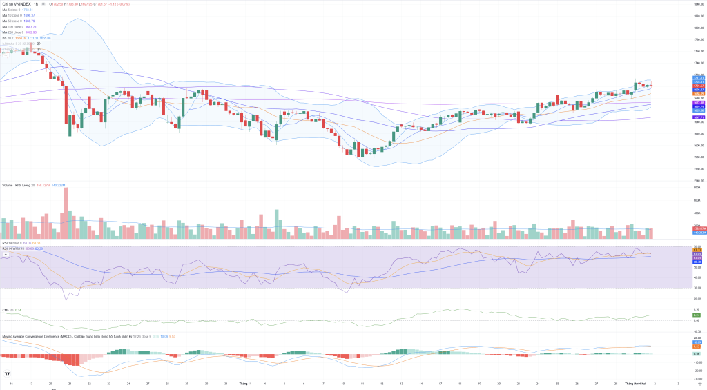 - Cấu trúc giá: Chỉ số đã tạo Đỉnh sau cao hơn (H: 1,713.77 cao hơn H: 1,696.14). Đáy (L: 1,697.38) cao hơn đáy gần nhất (L: 1,679.12). Cấu trúc đã chuyển sang xu hướng tăng ngắn hạn rõ ràng.