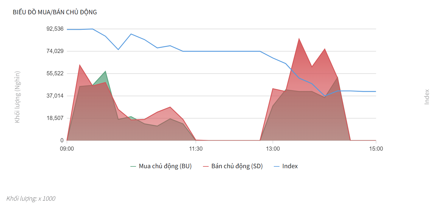- Đỉnh điểm của áp lực bán tháo xuất hiện vào khoảng 13:45, khi khối lượng bán chủ động vọt lên mức cao nhất ngày, đạt hơn 80.000 nghìn đơn vị.