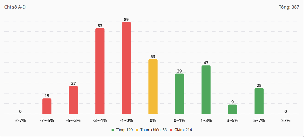 - Nhóm Ngân hàng đồng loạt chìm trong sắc đỏ và gây áp lực lớn: BID (-2.45 điểm), VCB (-2.30 điểm), TCB (-1.58 điểm) và CTG (-1.56 điểm).
