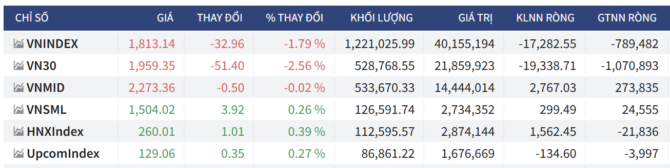 - Chốt phiên, VN-Index giảm 32,96 điểm (-1,79%), xuống 1.813,14 điểm; HNX-Index tăng 1,01 điểm (+0,39%), lên 260,01 điểm; UpCoM-Index tăng 0,35 điểm (+0,27%), lên 129,06 điểm