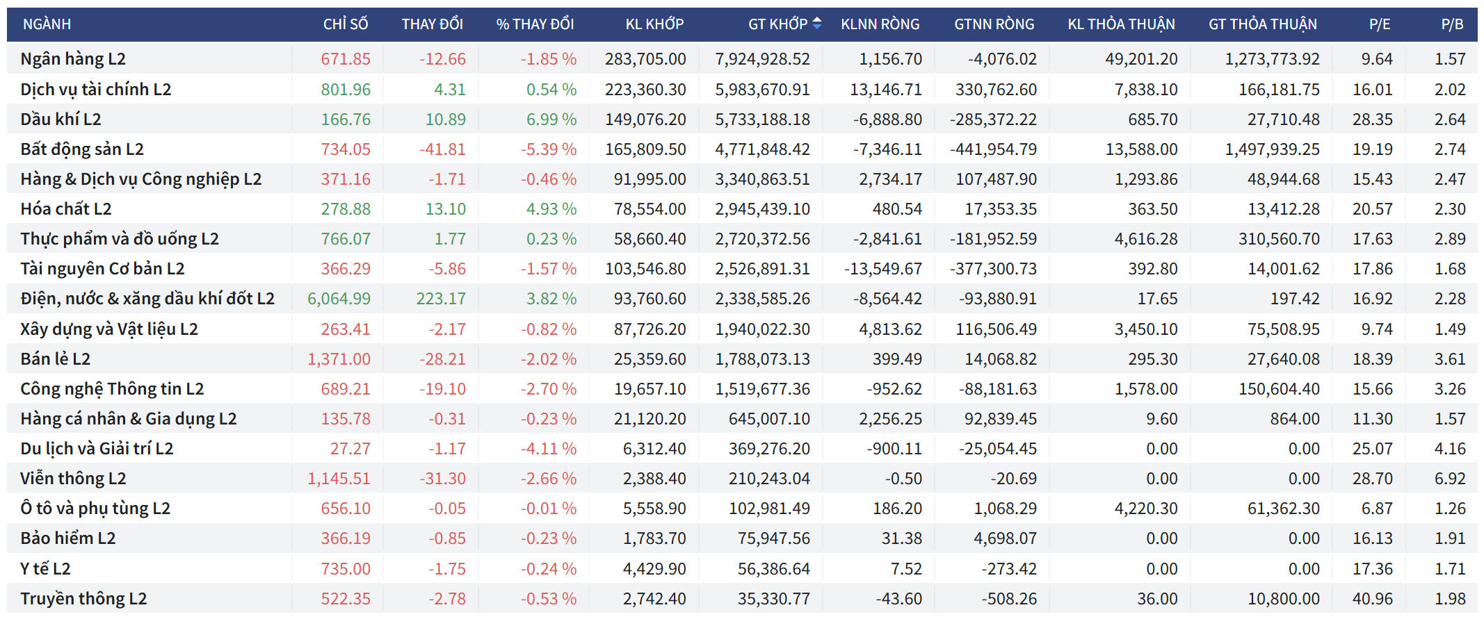- Nhóm Dầu khí và Năng lượng tiếp tục là trụ đỡ chính cho thị trường với các đại diện: GAS (+4.10 điểm), BSR (+2.44 điểm), PLX (+1.16 điểm) và POW (+0.68 điểm).