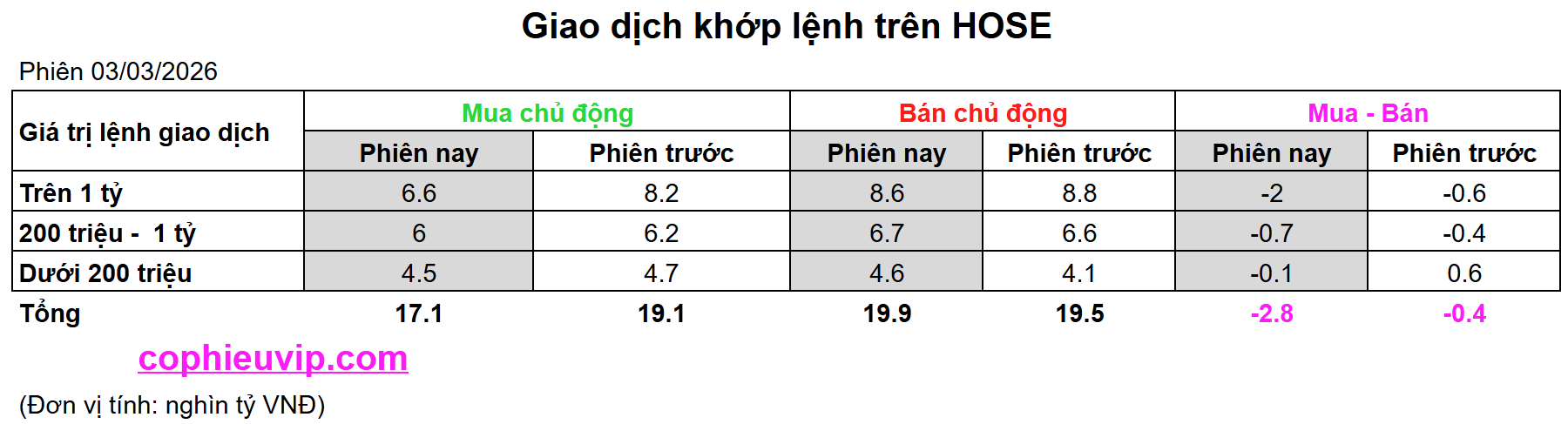 Kết luận sơ bộ: Diễn biến mua/bán chủ động phiên 03/03 cho thấy áp lực xả hàng vẫn diễn ra quyết liệt, đặc biệt là trong khung giờ giao dịch chiều khi khối lượng bán đạt đỉnh. Mặc dù chỉ số đã có nhịp rút chân nhẹ cuối ngày nhờ lực cầu bắt đáy gia tăng, nhưng nhìn chung phe bán vẫn đang cầm trịch cuộc chơi, đòi hỏi thị trường cần thêm thời gian để tìm điểm cân bằng cung cầu thực sự.