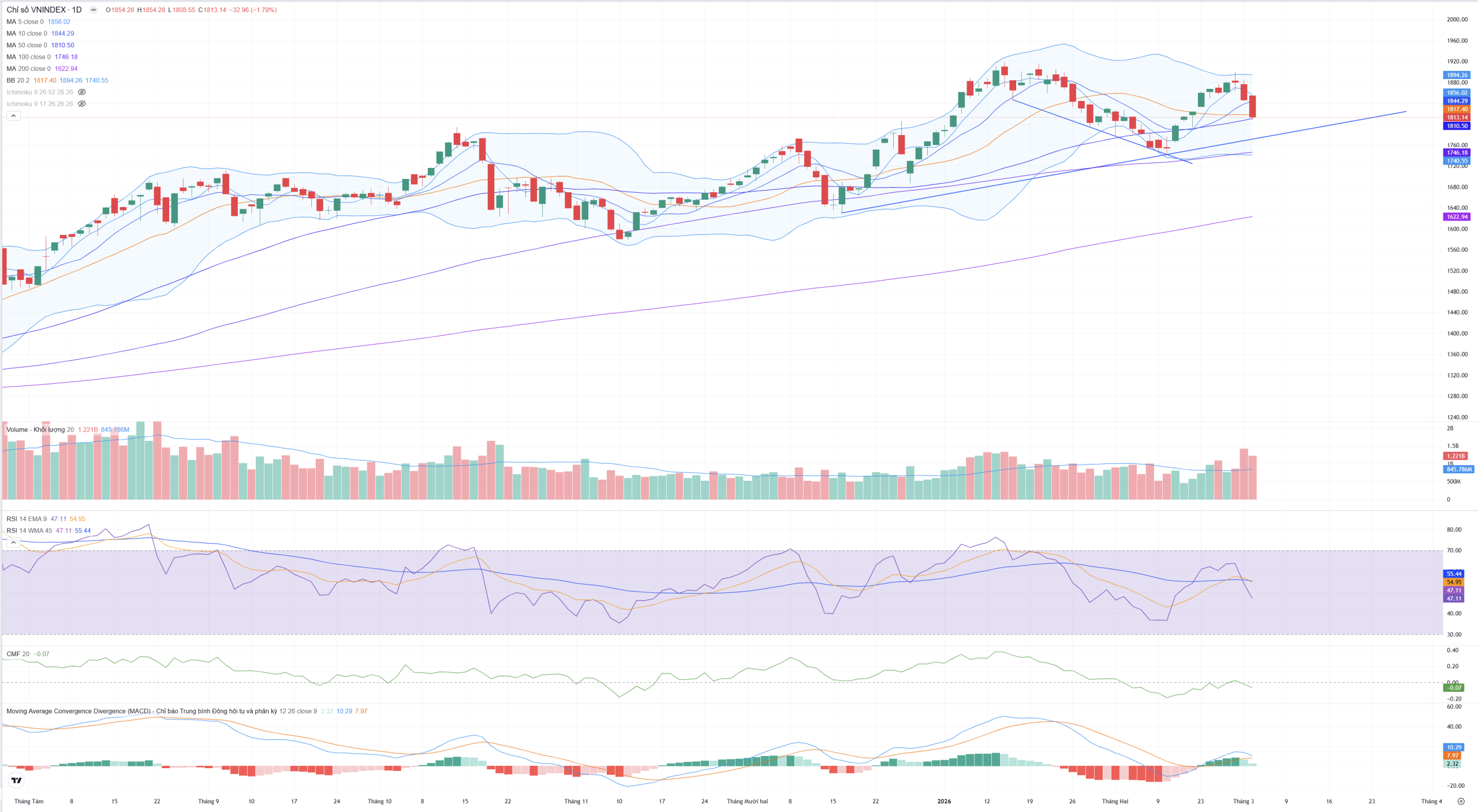 Kết luận sơ bộ: VN-Index đã có phiên giao dịch cực kỳ tiêu cực khi xuyên thủng đường trung bình 20 ngày (MA20) với thanh khoản lớn, xác nhận nhịp tăng điểm trước đó đã kết thúc và thị trường bước vào giai đoạn điều chỉnh ngắn đến trung hạn. Mọi chỉ báo từ xu hướng (MA), xung lực (RSI) đến dòng tiền (CMF) đều đồng thuận ở trạng thái xấu. Thị trường đang kỳ vọng vào lực cầu bắt đáy tại ngưỡng hỗ trợ MA50 quanh 1,810 để có một nhịp hồi phục kỹ thuật, tuy nhiên rủi ro điều chỉnh về các vùng sâu hơn như 1,740 vẫn đang hiện hữu.