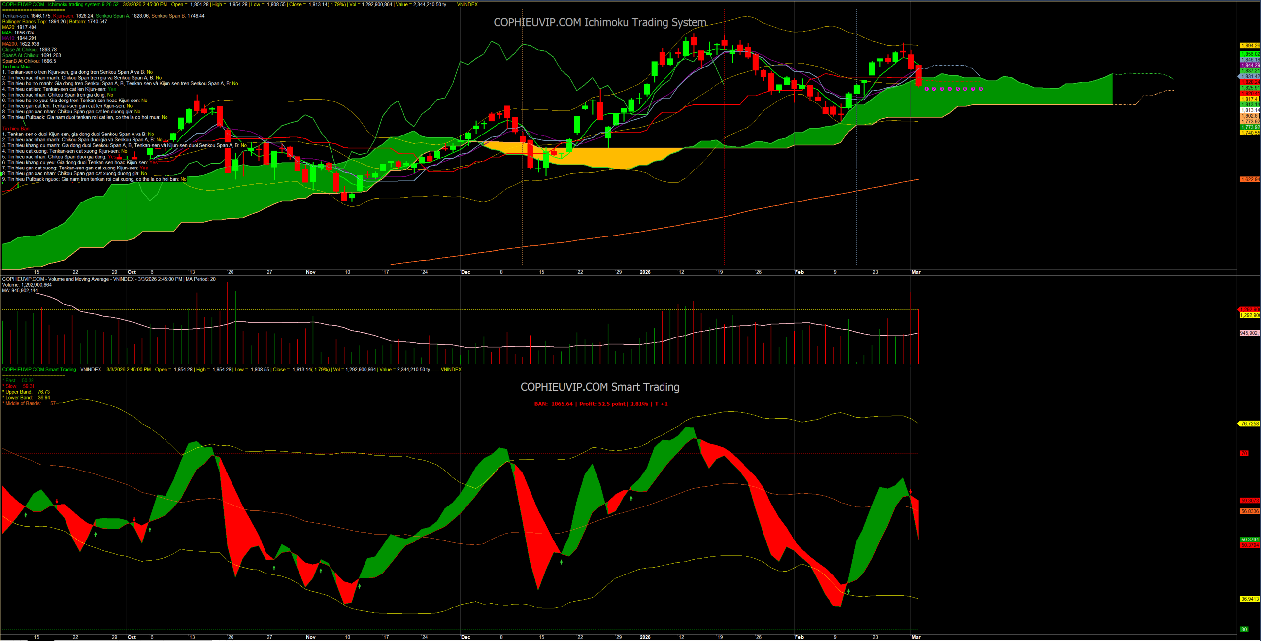 Về vĩ mô & Tin tức: Thị trường đang hấp thụ cú sốc kép từ việc đóng cửa eo biển Hormuz (đẩy giá dầu/khí tăng vọt) và áp lực thuế quan 193% của Mỹ lên ngành gỗ. Tuy nhiên, việc Ngân hàng Nhà nước bơm ròng hơn 34,771 tỷ đồng và kỳ vọng nâng hạng thị trường vào tháng 3/2026 là những yếu tố hỗ trợ thanh khoản và niềm tin trung hạn.