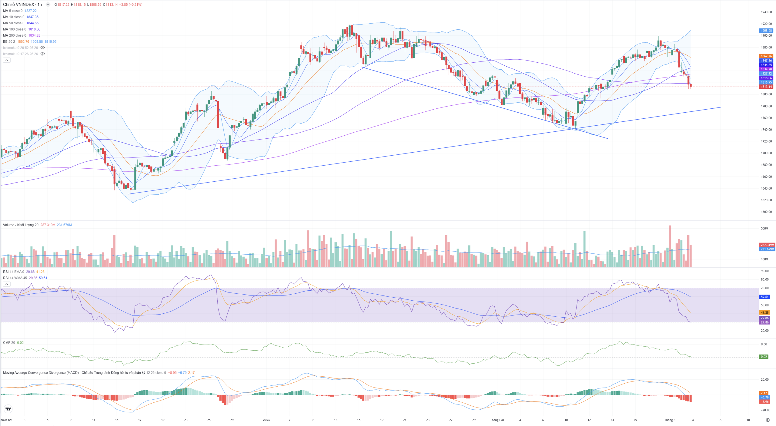 Kết luận sơ bộ: Đồ thị khung giờ (H1) cho thấy VN-Index đang trong trạng thái quá bán cực độ khi RSI giảm xuống dưới 30 và giá nằm ngoài dải Bollinger Bands dưới. Mặc dù xu hướng giảm vẫn đang áp đảo, nhưng sự xuất hiện của lực cầu bắt đáy trong giờ cuối (thể hiện qua nến rút chân và volume lớn) cùng chỉ báo CMF vẫn giữ được sắc xanh cho thấy khả năng thị trường sẽ có nhịp phục hồi kỹ thuật để kiểm định lại vùng 1,820 – 1,827 trong các giờ đầu phiên tới.
