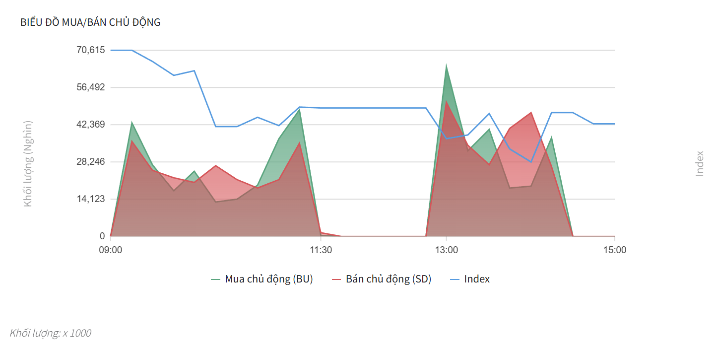 - Từ 13:30 đến cuối phiên, phe Bán chủ động hoàn toàn làm chủ thế trận với các cột diện tích đỏ liên tục mở rộng, đẩy đường chỉ số Index lao dốc mạnh mẽ.