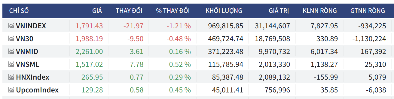 - Chốt phiên, VN-Index giảm 21,97 điểm (-1,21%) xuống 1.791,43 điểm; HNX-Index tăng 0,77 điểm (+0,29%) lên 265,95 điểm; UPCoM-Index tăng 0,58 điểm (+0,45%) lên 129,28 điểm
