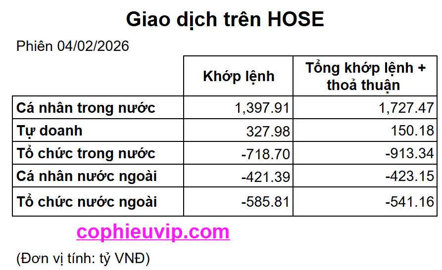 Kết luận sơ bộ: Phiên giao dịch ngày 04/02/2026 ghi nhận một trạng thái phân hóa cực đoan khi chỉ số VN-Index bị kéo sụt sâu do áp lực bán tháo khủng khiếp từ khối ngoại tập trung vào rổ VN30 (hơn 1.1 nghìn tỷ VNĐ). Trái ngược với diễn biến tiêu cực của các “trụ”, nhóm cổ phiếu vốn hóa vừa và nhỏ (Midcap, Smallcap) cùng sàn HNX vẫn giữ được sắc xanh và thu hút dòng tiền ngoại mua ròng nhẹ, cho thấy dòng tiền đang có xu hướng rút khỏi các mã lớn để tìm nơi trú ẩn ở các phân khúc vốn hóa thấp hơn.