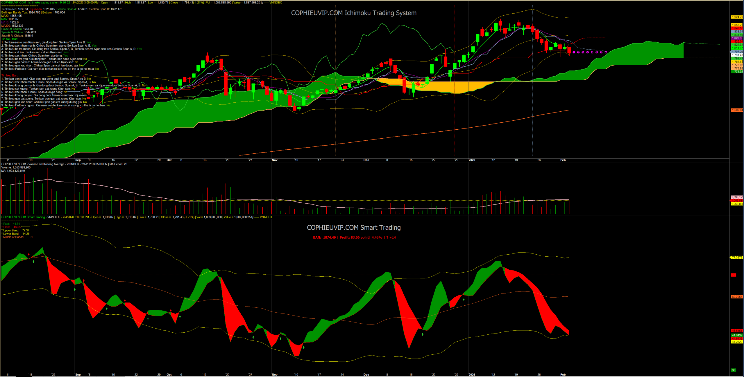 Kết luận sơ bộ: Phiên giao dịch ngày 04/02/2026 là một phiên tiêu cực khi VN-Index để mất mốc hỗ trợ tâm lý 1,800 và xuyên thủng dải dưới Bollinger Bands với áp lực bán từ dòng tiền lớn (CMF âm sâu). Điểm tựa duy nhất của thị trường lúc này là đường MA50 (1,778), nơi được kỳ vọng sẽ kích hoạt dòng tiền bắt đáy giúp chỉ số ổn định trở lại trong các phiên còn lại của tuần.