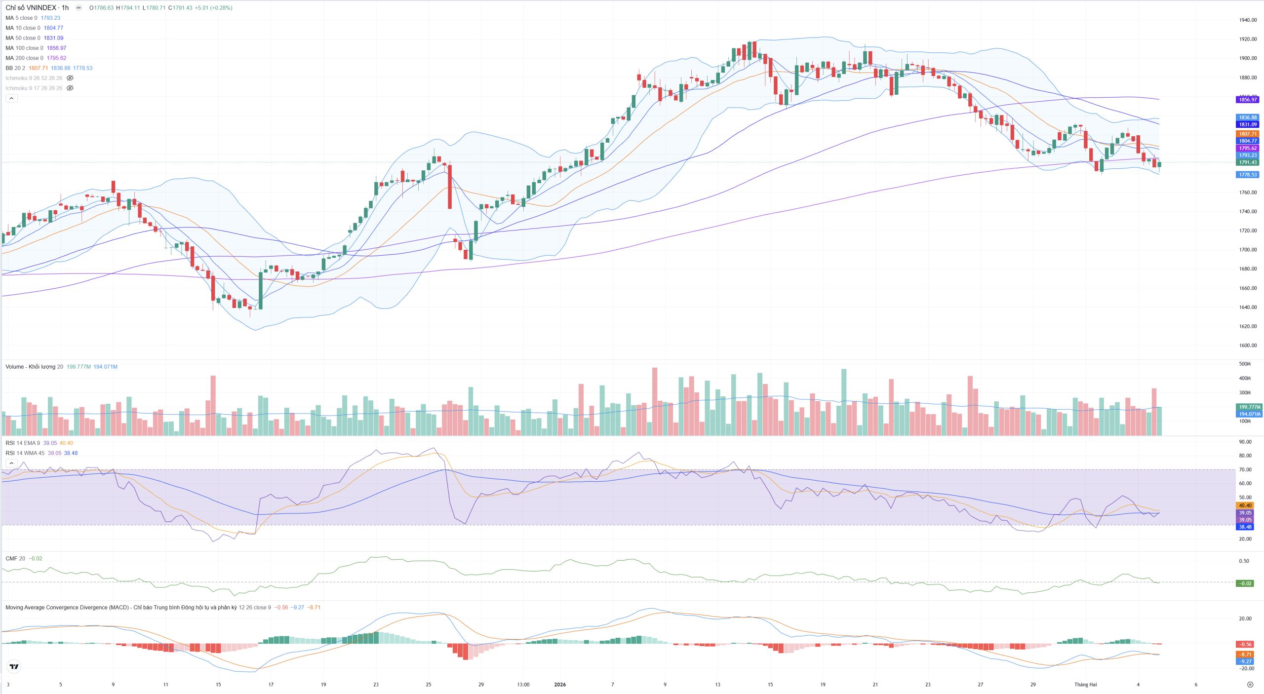 - Giá đóng cửa giờ cuối vẫn nằm dưới các đường trung bình động ngắn hạn gồm MA5 (1,793.23), MA10 (1,804.77) và trục giữa MA20 (1,807.71).