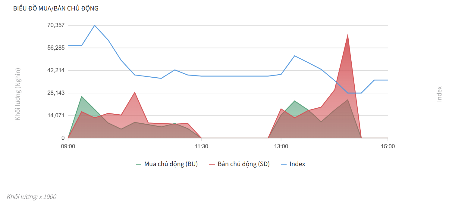 - Trong khi đó, lực mua chủ động (BU) dù có tăng lên để hấp thụ nhưng hoàn toàn bị nhấn chìm bởi áp lực bán. Chỉ số Index rơi sâu về mức thấp nhất trong phiên (vùng dưới 28,000 theo thang đo) trước khi có nhịp hồi kỹ thuật nhẹ vào cuối giờ.