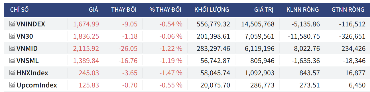 - Chỉ số VNINDEX: Đóng cửa tại mức 1.674,99 điểm, giảm -9,05 điểm (tương đương -0,54%). Khối lượng giao dịch đạt 556,78 triệu cổ phiếu với giá trị giao dịch đạt 14.505 tỷ VNĐ. Khối ngoại tiếp tục bán ròng với giá trị -116,5 tỷ VNĐ.
