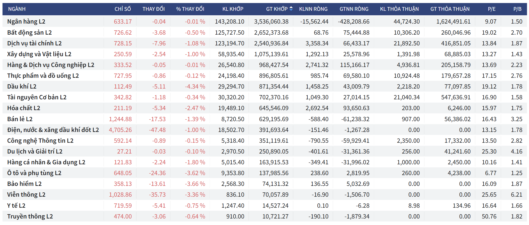 - Chỉ số VN30: Đóng cửa tại 1.836,25 điểm, giảm nhẹ -1,18 điểm (-0,06%). Giá trị giao dịch đạt 7.059 tỷ VNĐ. Đây là nhóm bị khối ngoại xả hàng mạnh nhất với giá trị bán ròng đạt -326,6 tỷ VNĐ.