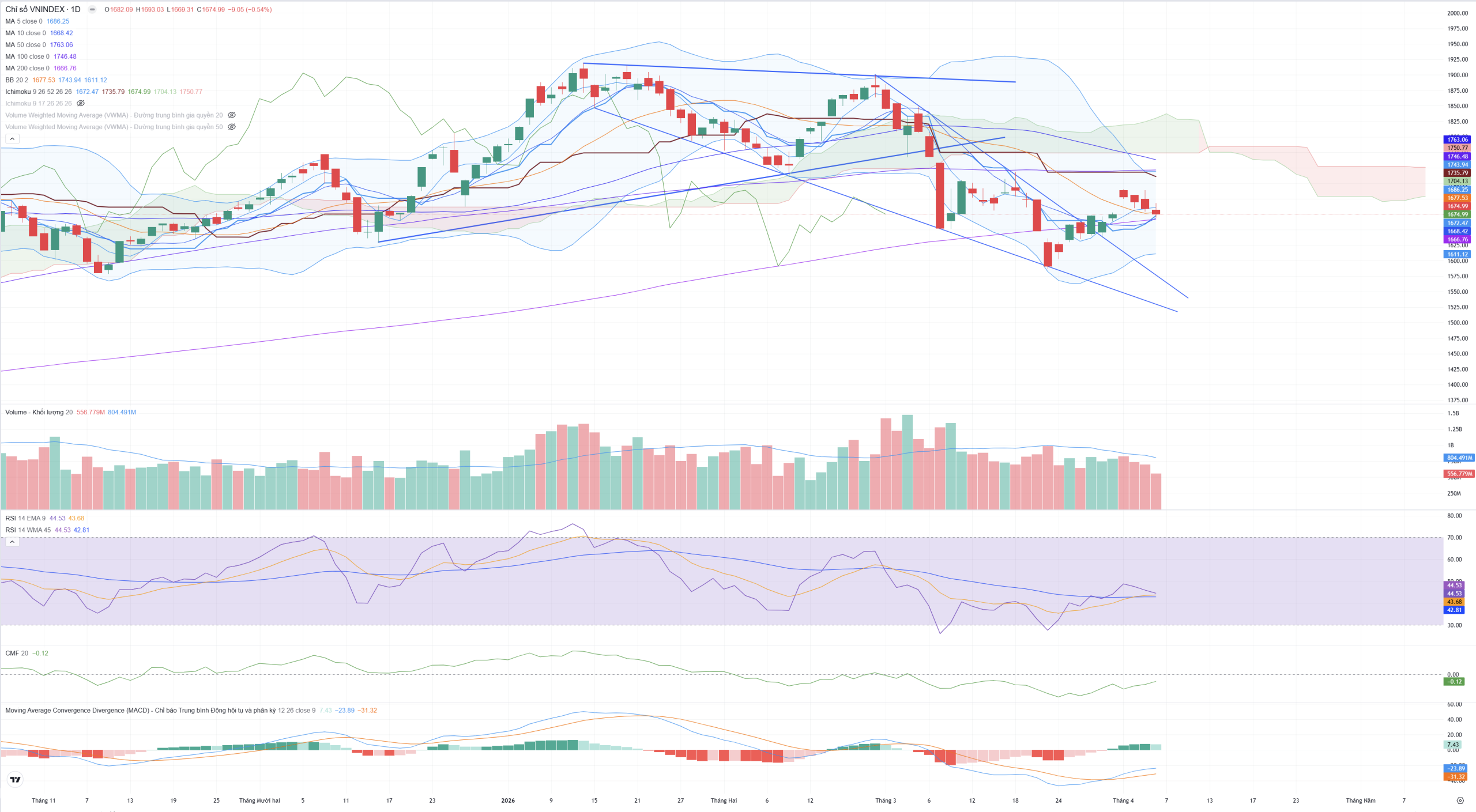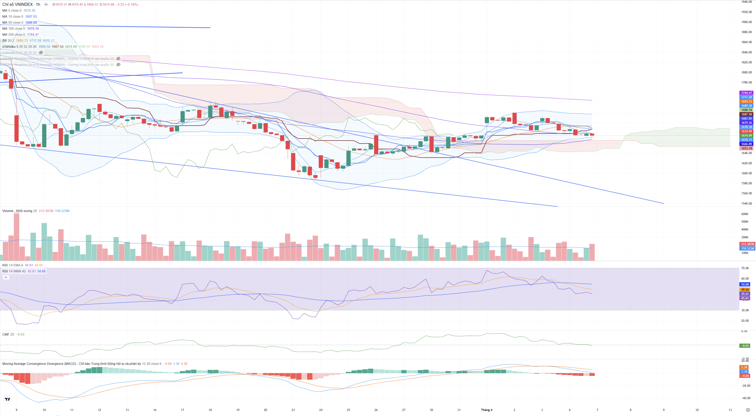 Khung đồ thị H1 của VN-Index phiên 06/04/2026 đang mô tả một trạng thái “bên bờ vực thẳm”. Việc chỉ số xuyên thủng MA100 H1 và chỉ được cứu vãn bởi MA200 Daily ở những phút cuối cho thấy tâm lý nhà đầu tư đã rất mỏng manh. Xung lực MACD âm sâu và RSI chưa có phân kỳ báo hiệu áp lực bán vẫn còn dư địa để tiếp diễn vào đầu phiên mai. Mọi con mắt lúc này đều đổ dồn vào “pháo đài” cuối cùng tại 1,666.