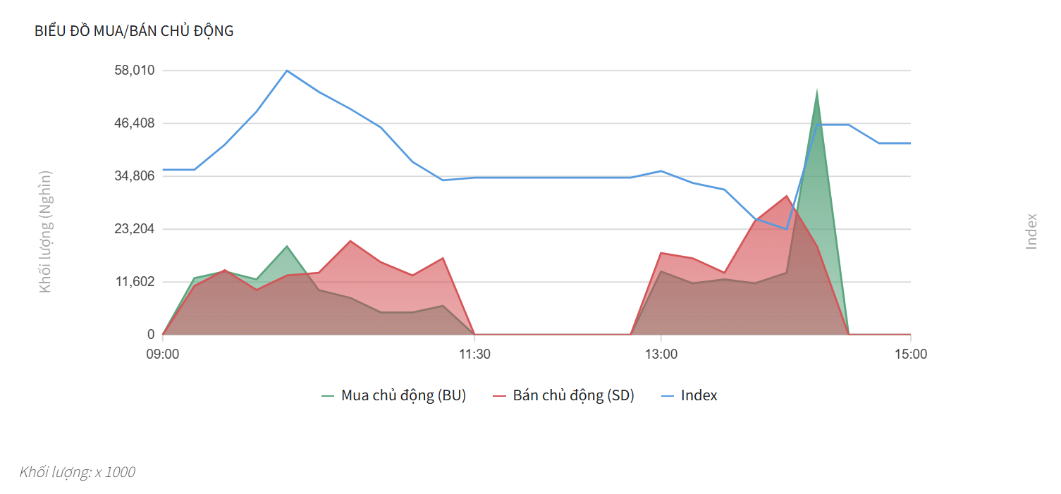 - Lực bán chủ động duy trì ở mức cao khiến chỉ số Index lao dốc không phanh từ đỉnh 58.010 về lại mốc 34.806 khi kết thúc phiên sáng. Lúc này, phe Bán đã lấy lại quyền kiểm soát thị trường.
