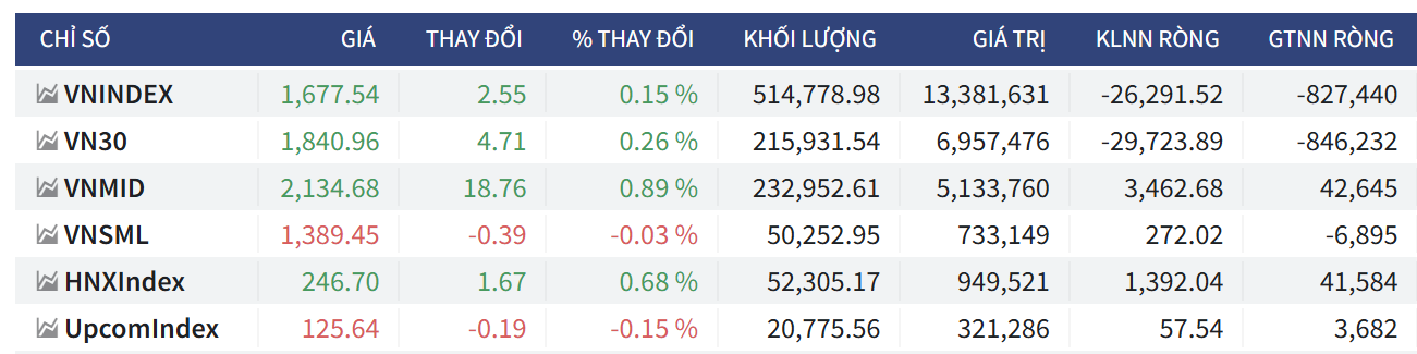 - Chỉ số VNINDEX: Đóng cửa tại 1,677.54 điểm, tăng nhẹ +2.55 điểm (tương đương +0.15%). Khối lượng giao dịch đạt 514.78 triệu cổ phiếu với giá trị giao dịch đạt 13,381.6 tỷ VNĐ. Đáng chú ý, khối ngoại đẩy mạnh bán ròng với giá trị lên tới -827.4 tỷ VNĐ.