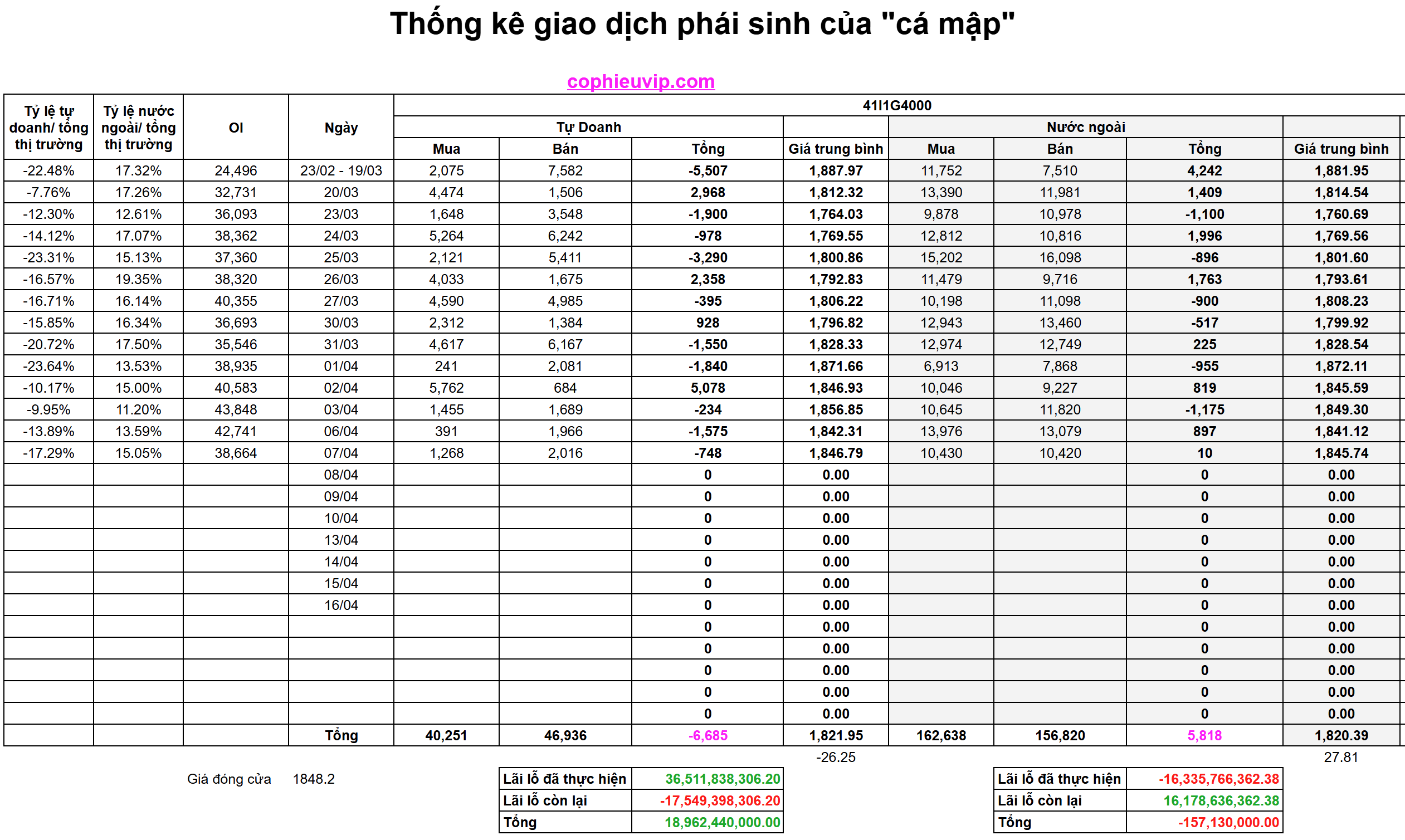 - Tổng vị thế mở (OI): Giảm mạnh xuống còn 38,664 hợp đồng (giảm 4,077 hợp đồng so với phiên 06/04). Việc OI giảm mạnh trong khi giá tăng và Basis dương thu hẹp cho thấy một lượng lớn vị thế Short đã thực hiện đóng lệnh (Cover Short) để chốt lời hoặc cắt lỗ trước các diễn biến mới.