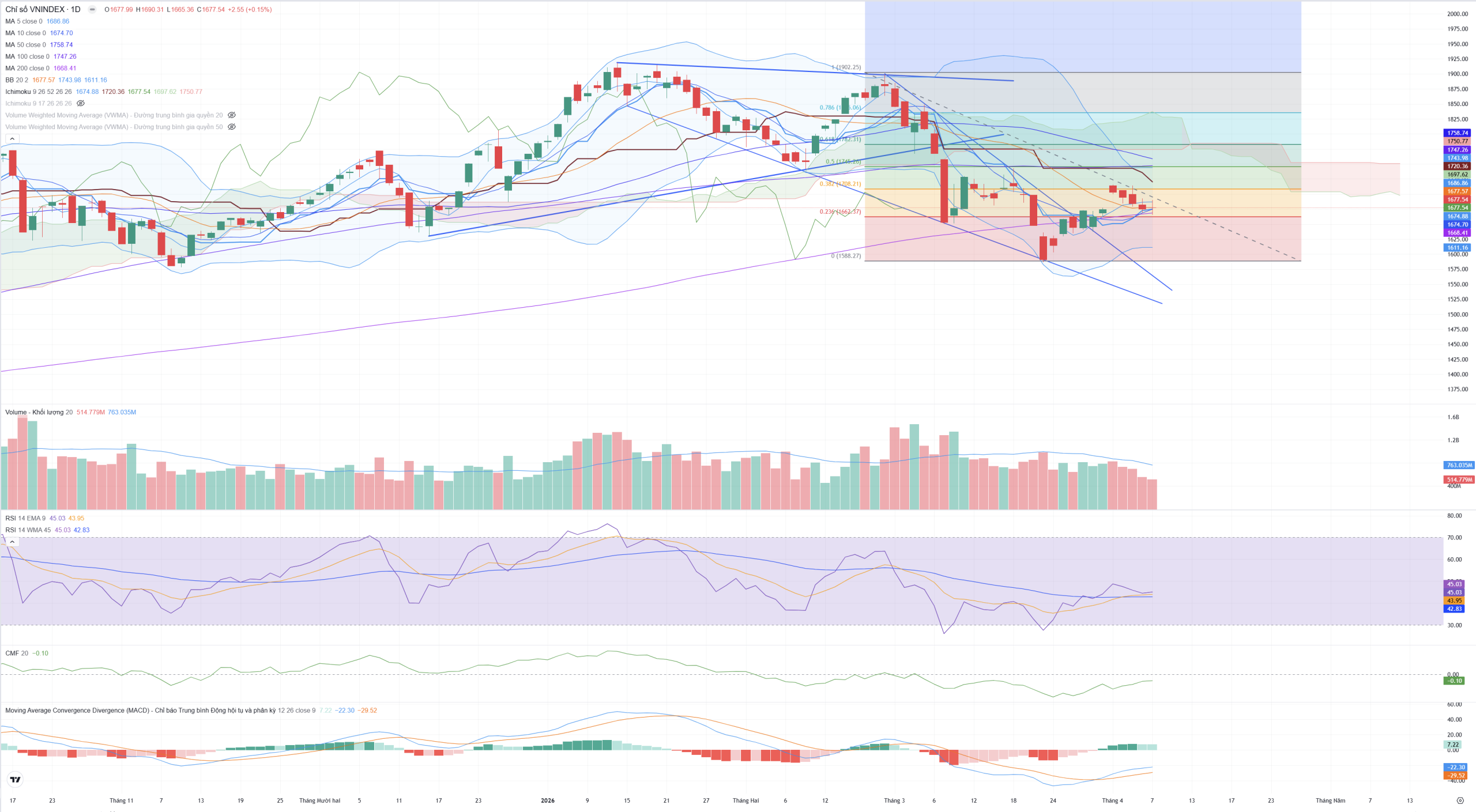 - Chỉ số đóng cửa sát nút đường MA20 (1.677,57) và giữ vững MA200 (1.668,41).