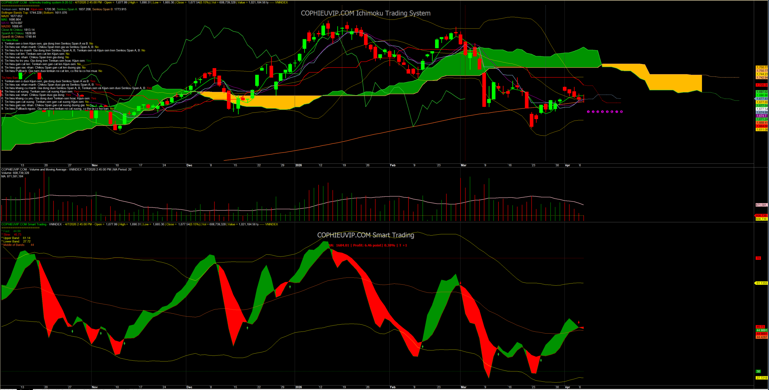 - Hành động của nhà đầu tư (Vị thế mua mới): Chỉ mua khi dải ruy băng Smart Trading chính thức chuyển sang màu xanh và giá đóng cửa trên 1.680.
