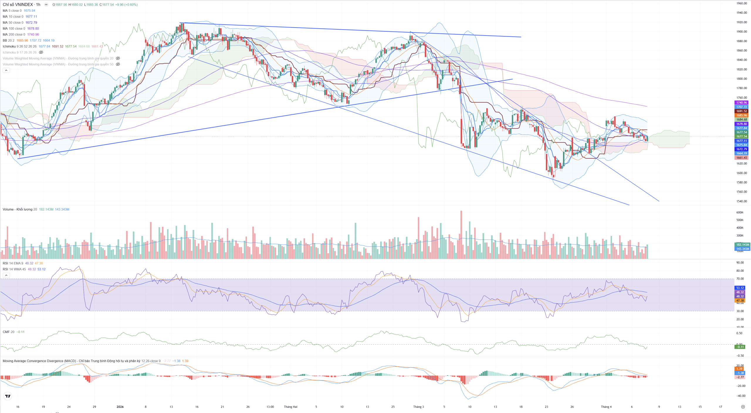Khung đồ thị H1 của VN-Index phiên 07/04/2026 đã hoàn thành một cú “đảo chiều” đầy ngoạn mục tại ngưỡng hỗ trợ MA200 Daily. Tín hiệu Phân kỳ dương RSI là điểm sáng nhất, cho thấy áp lực bán hoảng loạn đã được hấp thụ tốt. Mặc dù các chỉ báo xu hướng như MACD và dải băng chưa hoàn toàn xác nhận trạng thái tăng giá trở lại, nhưng nến Hammer rút chân kèm theo việc giữ vững mốc 1.670 là tiền đề rất tốt cho phiên ngày mai. Thị trường đang cho thấy nội lực phản kháng mạnh mẽ trước các biến số vĩ mô.