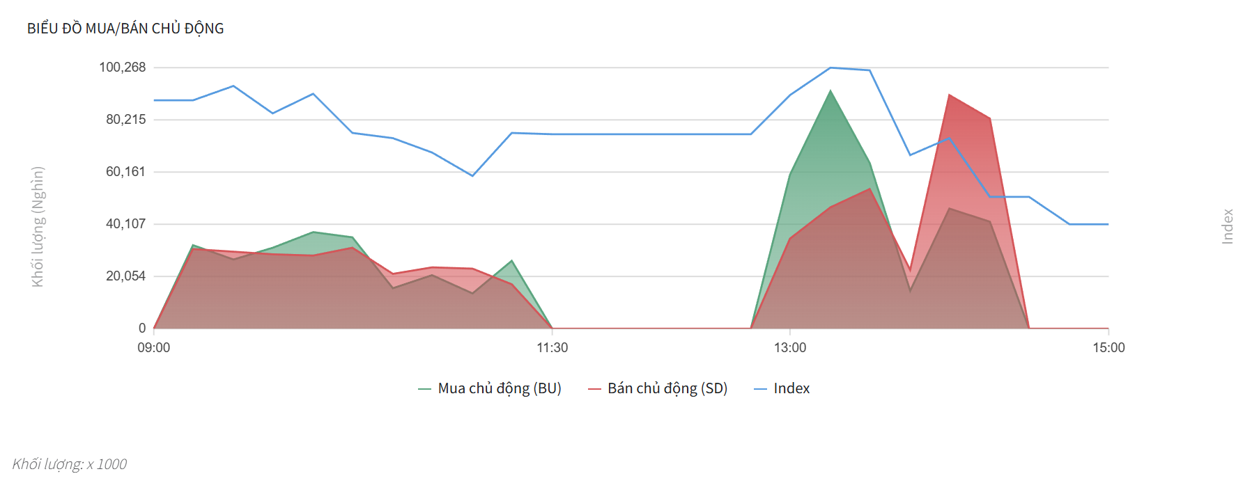 - Diễn biến giữa phiên sáng (10:00 – 11:30): Áp lực bán chủ động bắt đầu gia tăng dần và vượt qua lực mua, khiến đường chỉ số (Index) có xu hướng sụt giảm liên tục. Trạng thái bán chủ động áp đảo kéo dài cho đến khi kết thúc phiên sáng, cho thấy tâm lý chốt lời bắt đầu lan rộng.