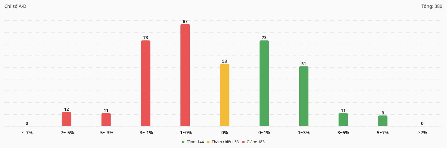 Độ rộng thị trường phiên 08/01/2026 nghiêng hoàn toàn về sắc đỏ với số mã giảm chiếm ưu thế tuyệt đối. Tổng số mã giảm giá từ mức 1% trở lên là 96 mã, cho thấy áp lực điều chỉnh không chỉ dừng lại ở việc rung lắc nhẹ mà đã bắt đầu xuất hiện những nhịp bán mạnh tập trung ở các nhóm cổ phiếu nhất định. Điều này phản ánh tâm lý thận trọng và hành động chốt lời quyết liệt của nhà đầu tư khi VN-Index tiệm cận các vùng kháng cự cao.